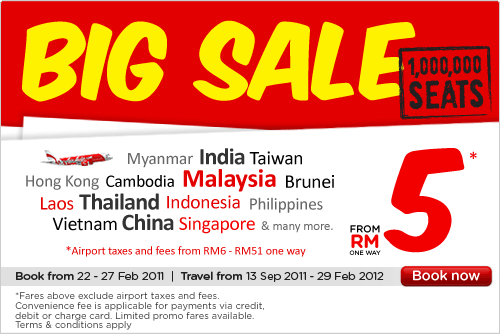 AirAsia’s “Big Sale” is back with one-way fares from just MYR5 (USD1.75) plus taxes/fees that range from MYR6 -51 (USD2 – 16.50) each way. All flights from Malaysia are on sale and destinations include China, Taiwan, Vietnam, Thailand, Philippines, Brunei, India, Sri Lanka, and more! Fares must be booked between February 22 and 27 and are valid for travel from September 13, 2011, until February 29, 2012.